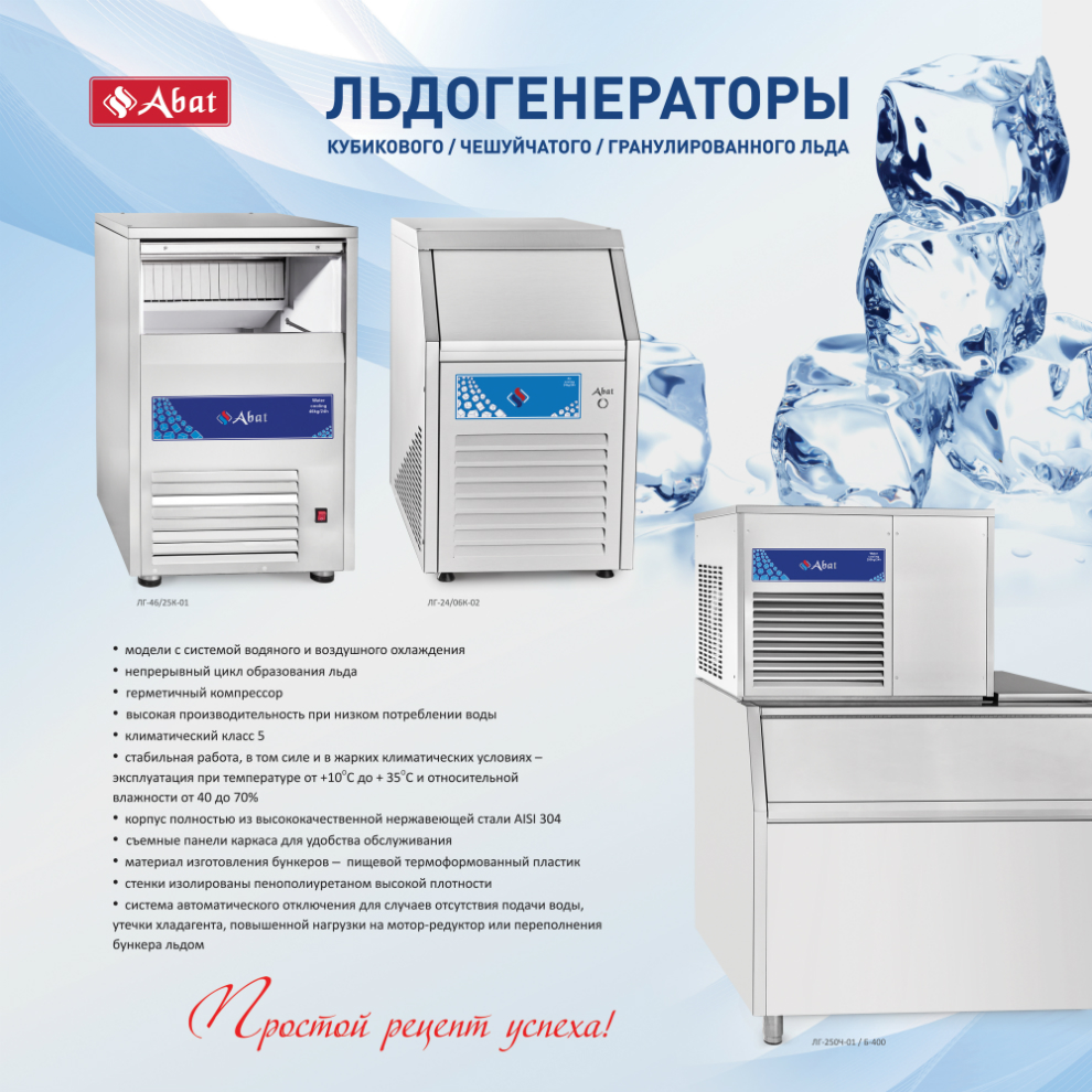 Льдогенератор ABAT ЛГ-250Ч-01 предназначен для производства чешуйчатого льда, который впоследствии используется для хранения овощей, фруктов, мяса, рыбы, охлаждения различных напитков, а также при производстве колбасных изделий и полуфабрикатов. Для намерзания льда используется вертикально ориентированный неподвижный барабан-испаритель, который обеспечивает герметичность системы и исключает необходимость применения подвижных уплотнителей. Корпус изготовлен из нержавеющей стали AISI 304. Стенки изолированы пенополиуретаном высокой плотности.