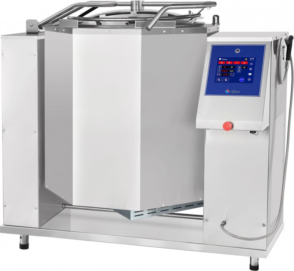 Опрокидывающийся электрический пищеварочный котёл ABAT КПЭМ-350-ОМП с миксером предназначен для кипячения воды, приготовления бульонов, супов, соусов, кремов, каш, омлетов, плова, рагу, карри, пюре и других блюд и напитков на предприятиях общественного питания и пищевой промышленности крупного формата. Благодаря усиленной конструкции миксера, плавной регулировке скорости и функции реверса может быть использован для взбивания и перемешивания практически любых продуктов. Нагрев воды производится способом "пароводяной рубашки". Оснащён откидной крышкой, которая может быть зафиксирована в верхнем положении.