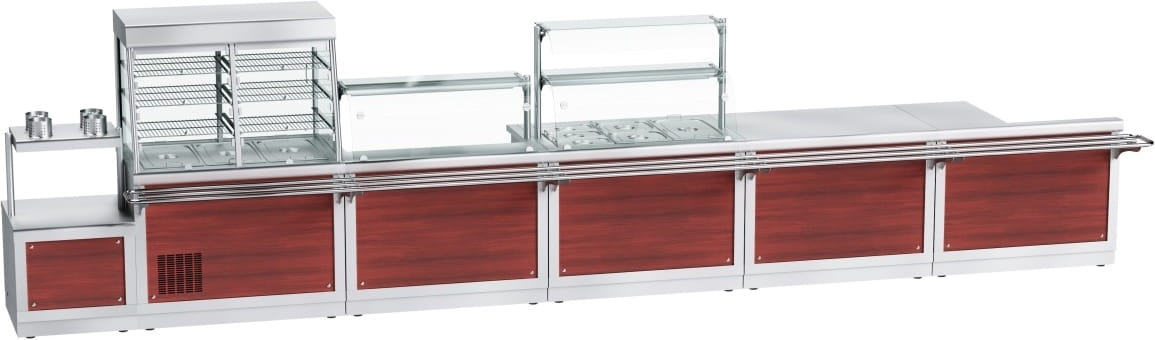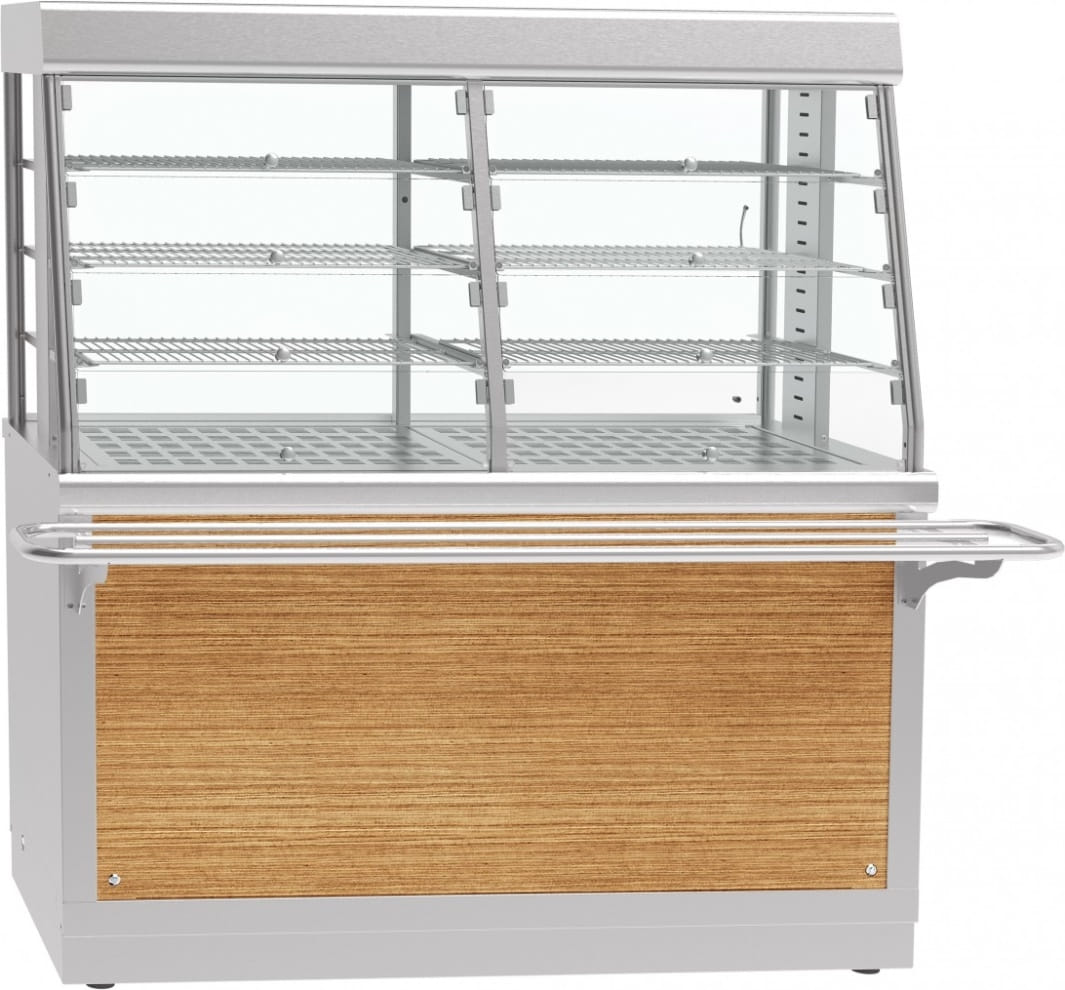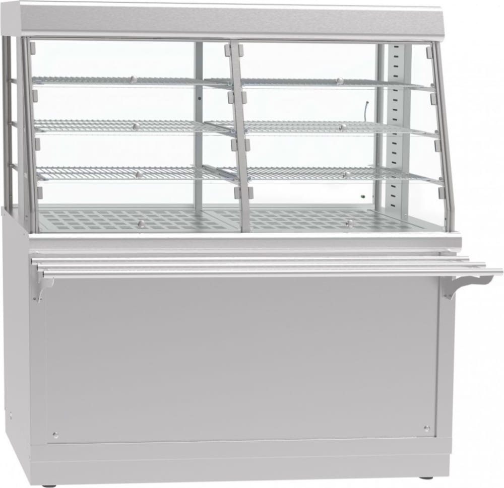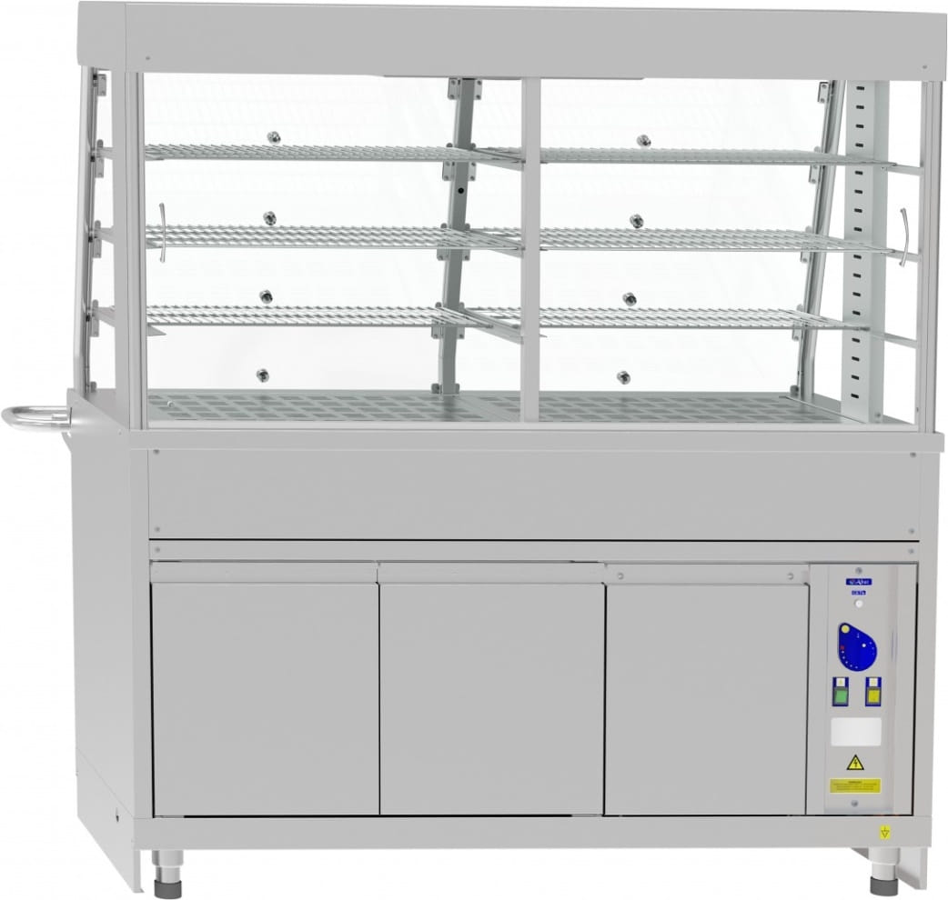Тепловая витрина-прилавок ABAT ПВТ-70Х-01 предназначена для раздачи и кратковременного хранения в тёплом состоянии кондитерских и хлебобулочных изделий, а также разнообразных блюд на тарелках и в гастроёмкостях на предприятиях общественного питания и торговли. Оснащена витриной с 3 рядами полок-решёток. Имеет регулируемые по высоте ножки.